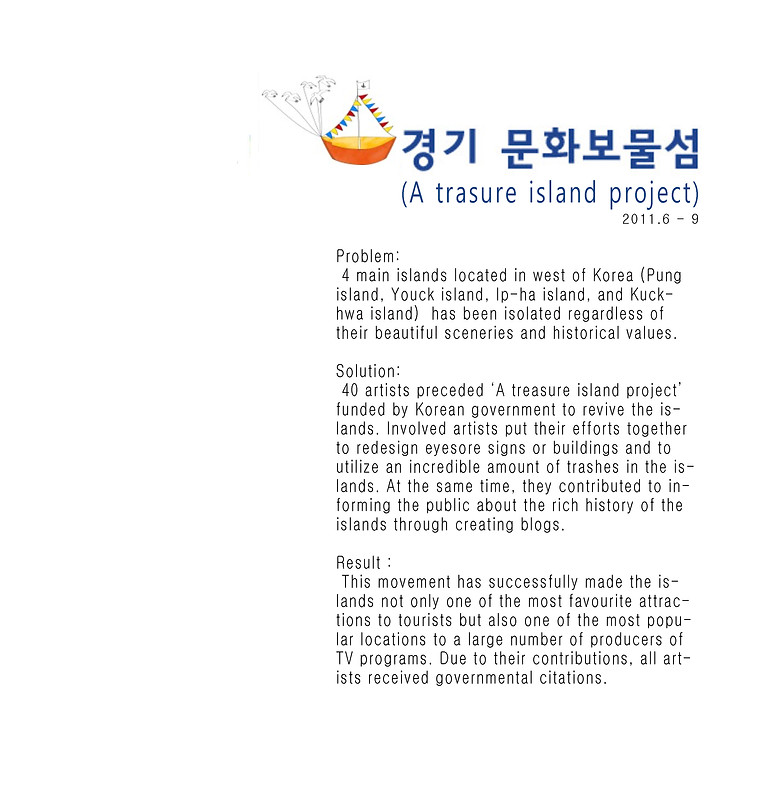 섬을 재생시키기 위해 40명의 예술가들이 한국 정부의 지원하에 '경기 문화 보물섬 프로젝트'를 진행했다. 관여한 예술가들은 눈에 거슬리는 간판과 건물들을 다시 디자인하고 섬에 축적된 엄청난 양의 쓰리기를 활용할 수 있도록 힘을 모았다. 이와 더불어 블로그를 만들어4개의 섬들이 가진 유구한 역사적 가치를 많은 사람들에 알릴 수 있도록 하였다.